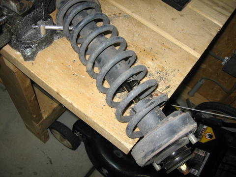 MC'S NOTE: I don't condone the following method of decompressing the spring, if you still decide to do it like this don't come blaming me if someone gets hurt or you break something. The proper way would be to get a spring compressor from an auto parts store to take the pressure off the spring so you can remove the nut.