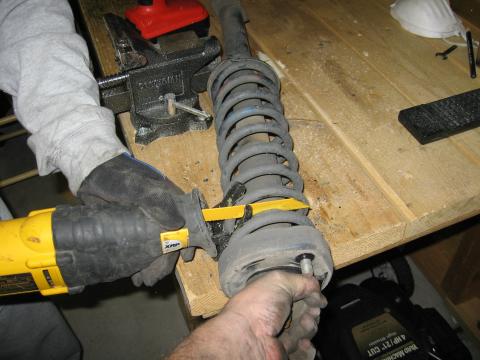 But of course we needed to get the top parts of the assembly because those parts are going to need to be reused. Since we don't have a spring compressor, we did what all people with a purpose do. WE CUT IT!!!