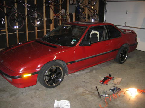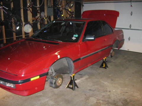 First thing we did is put the car in the garage and get the car up on stands and pull off the wheels.