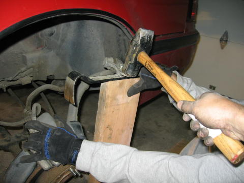 As you'll notice, I installed my Ingalls Camber Kit at the same time. The front studs aren't too bad to take out. Just get a board to put under stud on the upper arm part, then wack it like a wack a mole. The board pops out the stud.