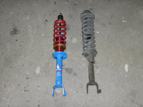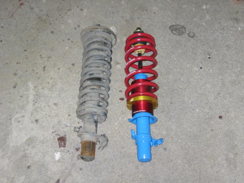 Then we pull off the the shocks for the install. Here is a picture of the old and new front and rear set up.