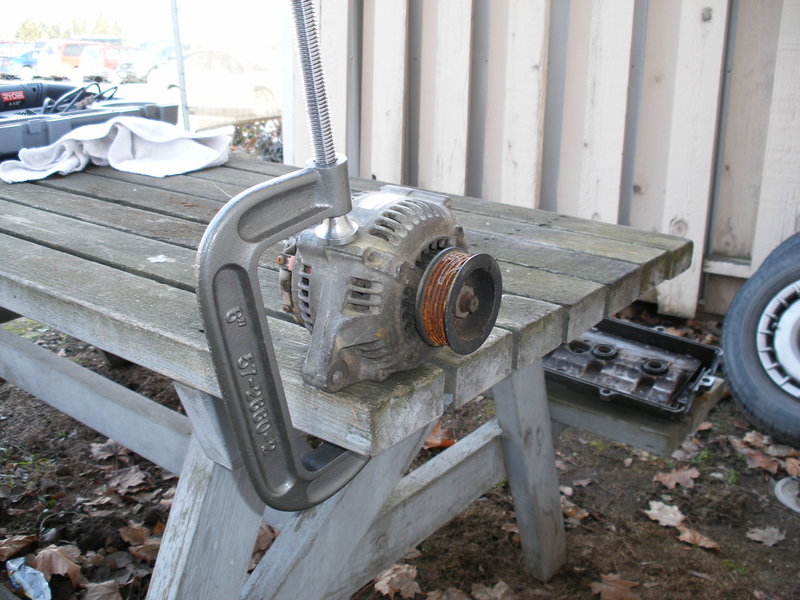When I did this, I used a C-clamp to hold the alternator to my picnic table. The best way to clamp the alternator, I think, is to set it up so that the pulley is perpendicular to the surface you’re working on. You don't have to go ape on it. Just make sure it won't fly off the table when you start grinding it.