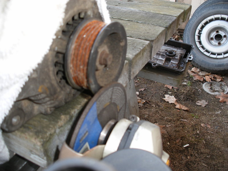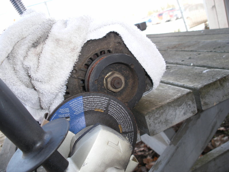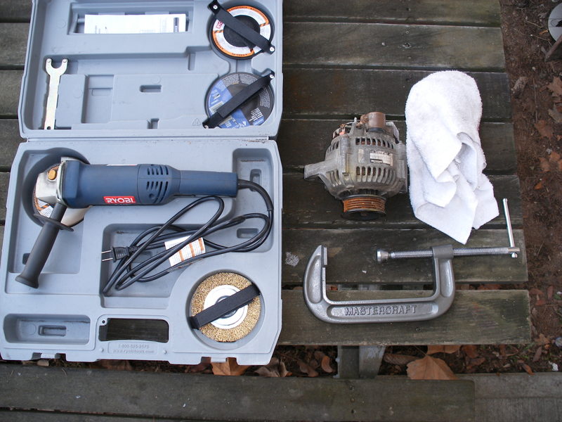 To do this job, you need an angle grinder or pneumatic equivalent (which everybody has, right!?), a ’94 Accord alternator with pulley, a flat, stable surface (kinda like a work bench), and a means of securing the alternator to the table/bench/whatever you’re using.