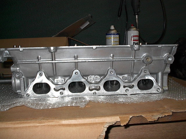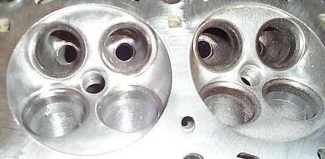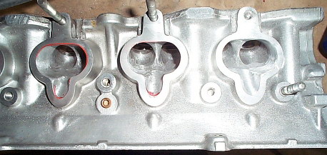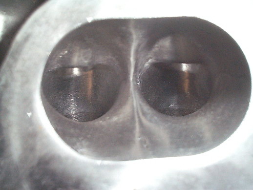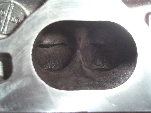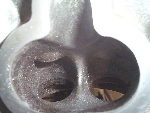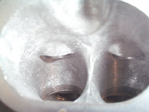 Intake side before work, if you look down by the valve seats, that's where they need the most work. If you stick you finger in from the cylinder side and feel the short turn radius there is a large "ledge" that must certainly interrupt air flow.