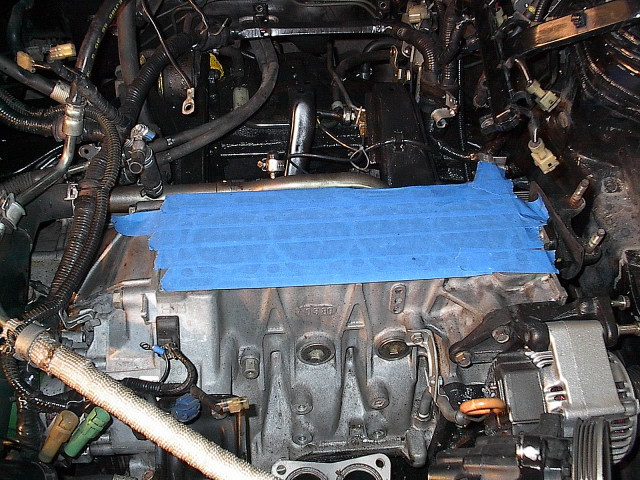 Getting ready to clean the engine. I scraped the old gasket off and cleaned the deck surface, then I applied painters tape over the whole deck to keep dirt out: