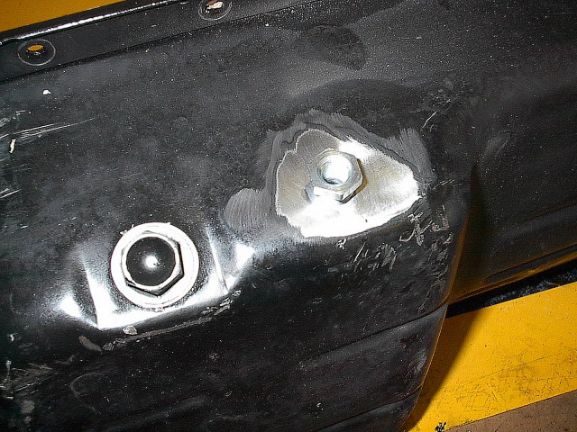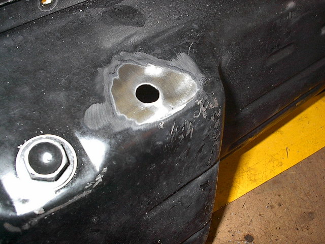 Now get sandpaper/wire brush/etc. and remove the paint all around the hole, it has to be clean bare metal. Once that is done clean the whole welding area on both sides with simple green again. The welding area need to be spotless as to avoid pinholes in the welds which could cause a leak: