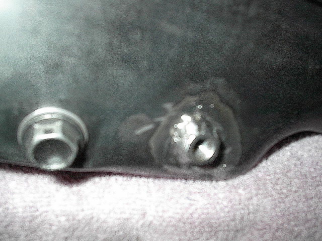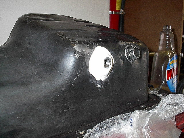 Now clean the inside and outside with solvent, after you have it as clean as you can get it spray it with simple green and clean it with that. Now pick where you want the sensor to be, obviously it has to be in a spot that will be submerged in the oil when the pan is full. I chose to put mine next to the drain plug. Once you have your spot picked, drill a hole that is the same size as the threads on the bung your using.