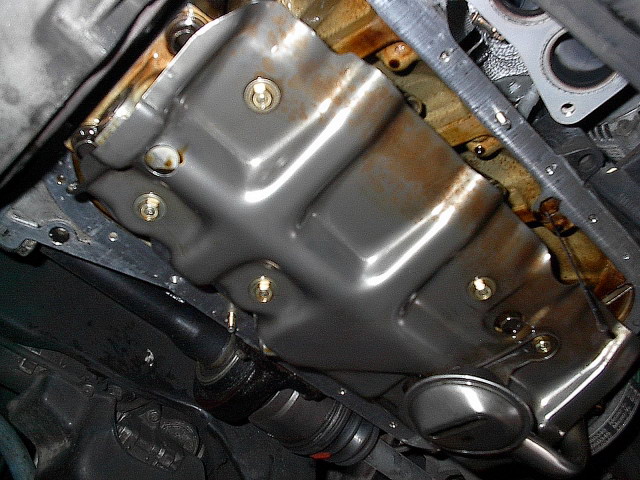 Now just put the downpipe and engine center beam back on and set the car back down. Fill it with oil and your done. When you start it up to test the sensor take it for a good drive because the oil seems to take 3x as long to get up to 180° than the water does. 3 days after the install or when you get some miles on it check for leaks and re torque the oil pan bolts. (Silicone will sometimes take a set)