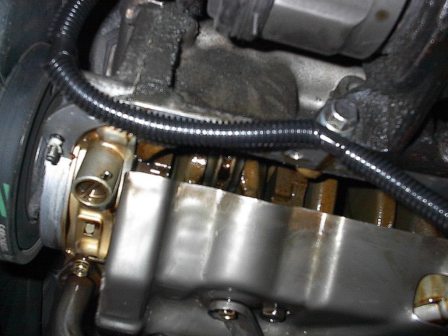 This is looking up from the bottom drivers side of the block. The wire brackets are hooked to one of the water pump bolts and the other is hooked to the very bottom side cover bolt: