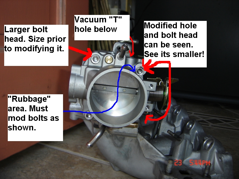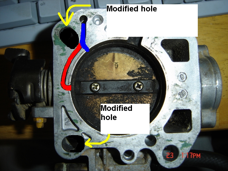I made these holes in the TB with a drill and an air rasp. It took quite a while to open up the holes enough to pass over the studs on the intake manifold. I drilled and cleaned out the holes until it slid onto the studs. I do not have pictures of the modified throttle body. But I will do the best I can with internet pictures to show how to do all the mods.