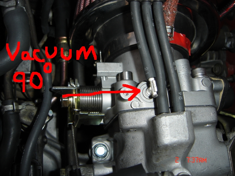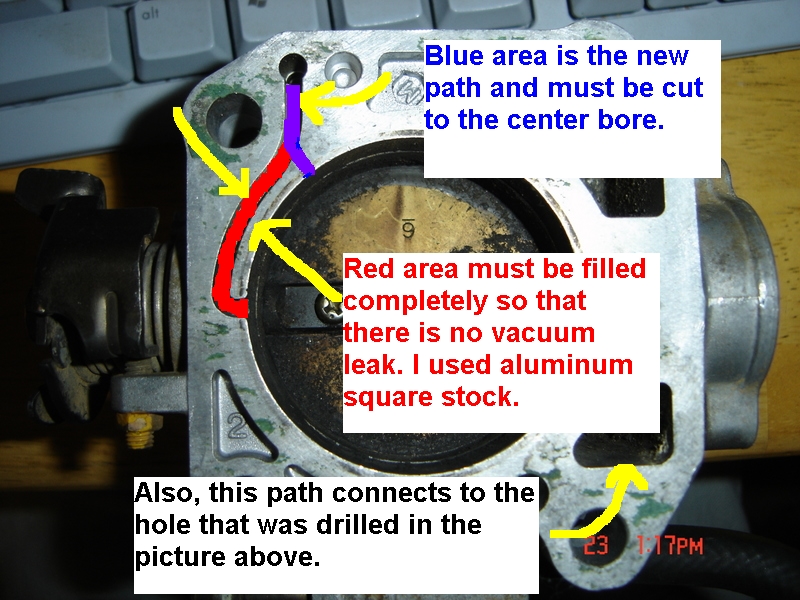 Also, the map sensor path will need to be modified. The path on the backside of the throttle body needs to be filled with either aluminum pieces or welded up and filed flush. I pressed pieces of aluminum into the area. The reason being is that the bigger throttle body is wider. Being that the map sensor path has to go around the outside of the bore, it results in the path being exposed to the atmosphere. The path actually goes outside of the gasket and outside of the edge of the Intake manifold. So Here is a pic of where to modify the path. To finish with the map sensor path you'll need to put a vacuum "T" or 90 into the hole where the map sensor would bolt up on any newer honda. Pic below: