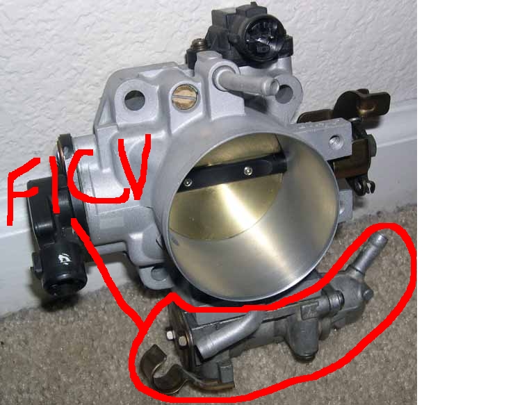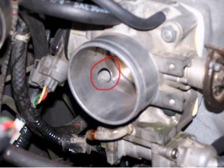 Below is a picture of the hole that WAS NOT in my Type R throttle body. So I had to drill this hole so that the air boost valve, FICV, etc would work properly... The hole that needs to be drilled is shown in the pic with a circle. This is not an actual picture of my throttle body, but similar.