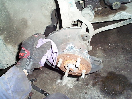 Look around the back of the rotor/hub assembly and you will see the bracket the caliper was bolted to is held on with 2 17mm bolts. Remove those and take the bracket off.