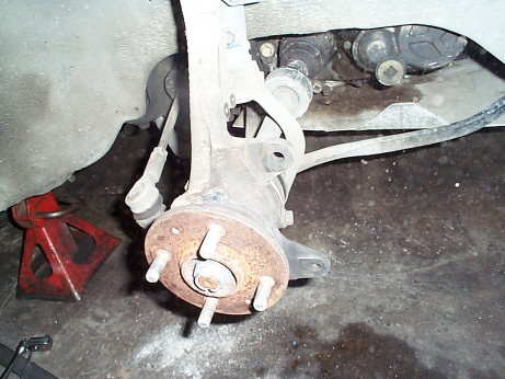 2. Jack up the car and take off the wheels. I prefer to jack the whole thing up and put a stand under each corner, that way I have access to all the corners at once and it makes bleeding the system easier and faster.
